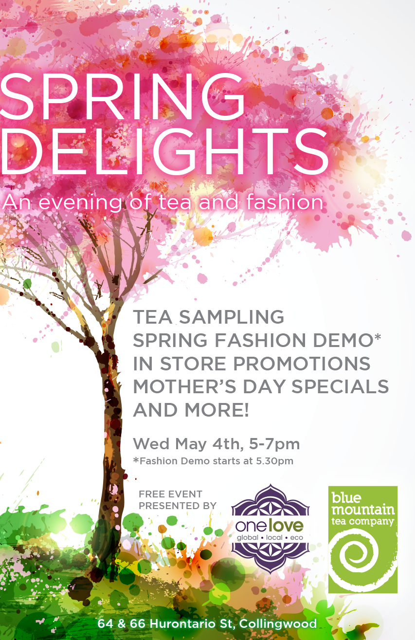 Event poster for Collingwood OneLove eco fashion store and Blue Mountain Tea Company.